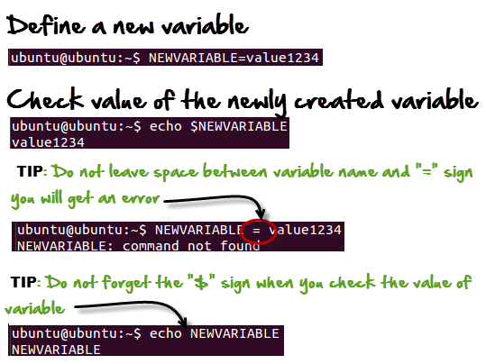 | Variable | VARIABLE_NAME= variable_value Again, bear in mind that variables are case-sensitive and usually they are created in upper case. Deleting VariablesThe following syntax can be used to remove a Variable from the system.