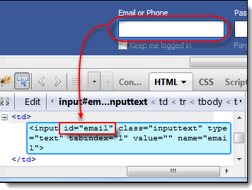 Step 1. Since this tutorial was created, Facebook has changed their Login Page Design. Use this demo page http://demo.gtupapers.com/test/facebook.html for testing. Inspect the "Email or Phone" text box using Firebug and take note of its ID. In this case, the ID is "email."