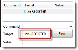 Step 4. Click on the Find button and notice that Selenium IDE was able to highlight the REGISTER link correctly.