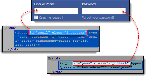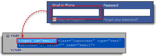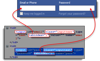 Step 1. Go to the demo page http://demo.gtupapers.com/test/facebook.html and use Firebug to inspect the 'Email or Phone' and 'Password' input boxes. Take note of their HTML tag, class, and attributes. For this example, we will select their 'tabindex' attributes.