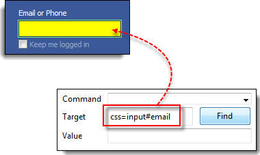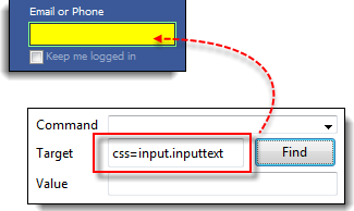 Step 2. In Selenium IDE, enter "css=input.inputtext" in the Target box and click Find. Selenium IDE should be able to recognize the Email or Phone text box.