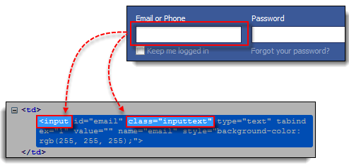 Step 1. Go to the demo page http://demo.gtupapers.com/test/facebook.html and use Firebug to inspect the "Email or Phone" text box. Notice that its HTML tag is "input" and its class is "inputtext."