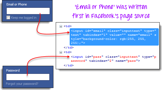 The reason why only the Email or Phone text box was highlighted in the previous illustration is that it comes first in Facebook's page source.