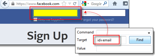 Step 2. Launch Selenium IDE and enter "id=email" in the Target box. Click the Find button and notice that the "Email or Phone" text box becomes highlighted with yellow and bordered with green, meaning, Selenium IDE was able to locate that element correctly.