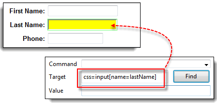 Step 2. In Selenium IDE, enter "css=input[name=lastName]" in the Target box and click Find. Selenium IDE should be able to access the Last Name box successfully.