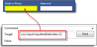 Step 2. We will access the 'Email or Phone' text box first. Thus, we will use a tabindex value of 1. Enter "css=input.inputtext[tabindex=1]" in Selenium IDE's Target box and click Find. The 'Email or Phone' input box should be highlighted.