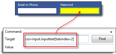 Step 3. To access the Password input box, simply replace the value of the tabindex attribute. Enter "css=input.inputtext[tabindex=2]" in the Target box and click on the Find button. Selenium IDE must be able to identify the Password text box successfully.