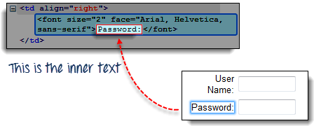 Step 1. Navigate to Mercury Tours' homepage (http://demo.gtupapers.com/test/newtours/) and use Firebug to investigate the "Password" label. Take note of its HTML tag (which is "font" in this case) and notice that it has no class, id, or name attributes.