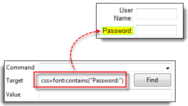 Step 2. Type css=font:contains("Password:") into Selenium IDE's Target box and click Find. Selenium IDE should be able to access the Password label as shown in the image below.