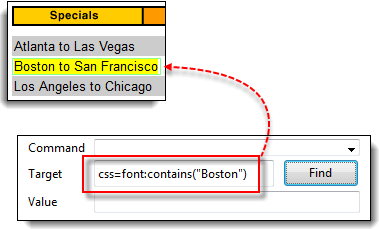 Step 3. This time, replace the inner text with "Boston" so that your Target will now become "css=font:contains("Boston")". Click Find. You should notice that the "Boston to San Francisco" label becomes highlighted. This shows you that Selenium IDE can access a long label even if you just indicated the first word of its inner text.