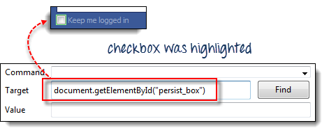 Step 2. Open Selenium IDE and in the Target box, enter "document.getElementById("persist_box")" and click Find. Selenium IDE should be able to locate the "Keep me logged in" check box. Though it cannot highlight the interior of the check box, Selenium IDE can still surround the element with a bright green border as shown below.