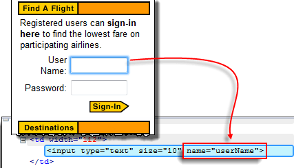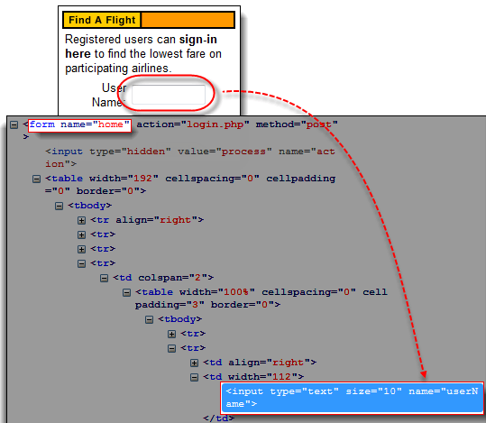 Step 1. Navigate to Mercury Tours homepage (http://demo.gtupapers.com/test/newtours/) and use Firebug to inspect the User Name text box. Notice that it is contained in a form named "home."