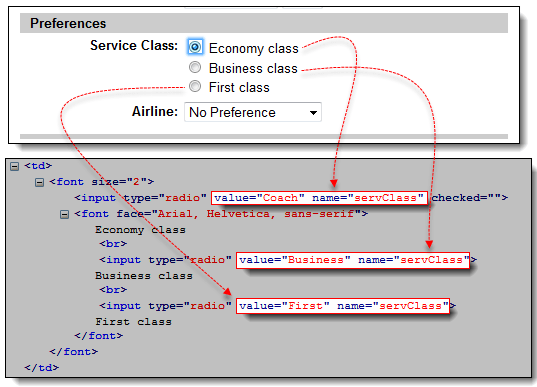 Step 2. Using Firebug, inspect the three radio buttons at the bottom portion of the page (Economy class, Business class, and First class radio buttons). Notice that they all have the same name which is "servClass".