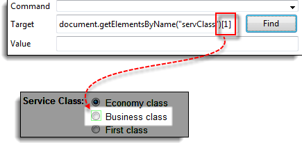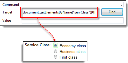 Step 4. Change the index number to 1 so that your Target will now become document.getElementsByName("servClass")[1]. Click the Find button, and Selenium IDE should be able to highlight the "Business class" radio button, as shown below.