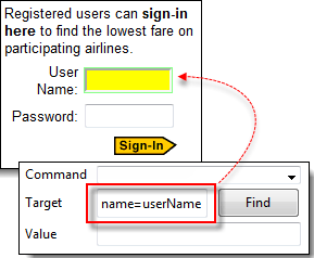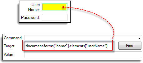 Step 2. In Selenium IDE, enter "name=userName" in the Target box and click the Find button. Selenium IDE should be able to locate the User Name text box by highlighting it.