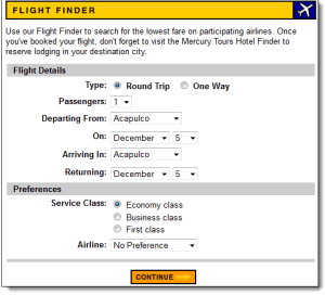 Step 1. Log on to Mercury Tours using "tutorial" as the username and password. It should take you to the Flight Finder page shown below.