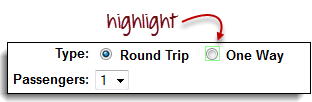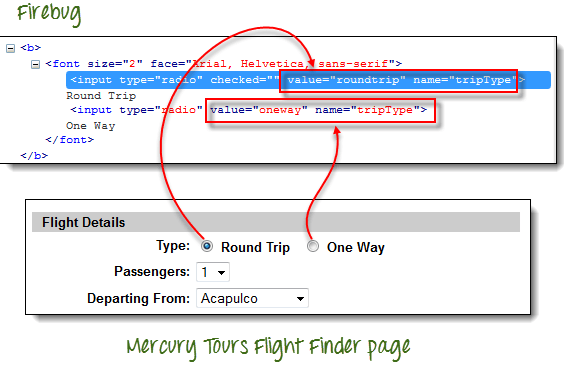Step 2. Using Firebug, notice that the Round Trip and One Way radio buttons have the same name "tripType." However, they have different VALUE attributes so we can use each of them as our filter.