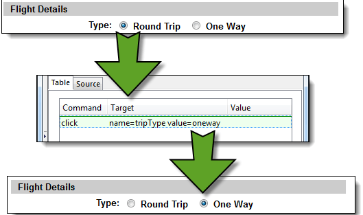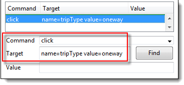 Step 4. Click the Find button and notice that Selenium IDE is able to highlight the One Way radio button with green - meaning that we are able to access the element successfully using its VALUE attribute.