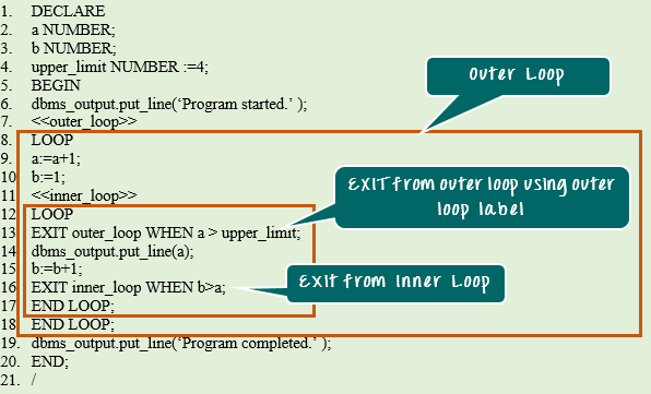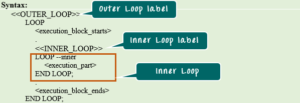 <<OUTER_LOOP>> LOOP <execution_block_starts> . <<INNER_LOOP>> LOOP --inner <execution_part> END LOOP; . <executi_block_ends> END LOOP;Syntax Explanation: