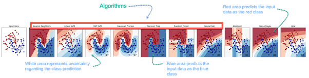 In the Machine learning example below, the task is to predict the type of flower among the three varieties. The predictions are based on the length and the width of the petal. The picture depicts the results of ten different algorithms. The picture on the top left is the dataset. The data is classified into three categories: red, light blue and dark blue. There are some groupings. For instance, from the second image, everything in the upper left belongs to the red category, in the middle part, there is a mixture of uncertainty and light blue while the bottom corresponds to the dark category. The other images show different algorithms and how they try to classified the data.