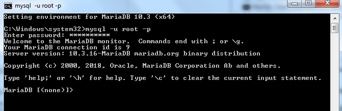 Step 3) The MariaDB command prompt will be started. It is now time to login. You should login as the root user and the password that you set during the installation of MariaDB. Type the following command on the command prompt: