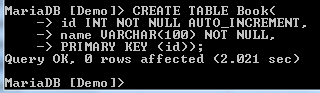 CREATE TABLE Book( id INT NOT NULL AUTO_INCREMENT, name VARCHAR(100) NOT NULL, PRIMARY KEY (id));