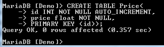 CREATE TABLE Price( id INT NOT NULL AUTO_INCREMENT, price float NOT NULL, PRIMARY KEY (id));