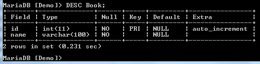 For example, to see the structure of the table named Book, you can run the following command;