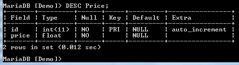 The table has two columns. To see the structure of the Price table, you can run the following command: