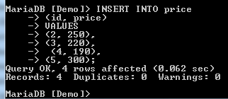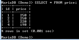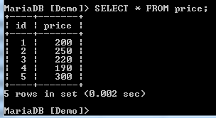 To demonstrate this, we will use the Price table with the following data: