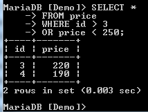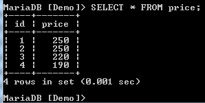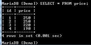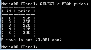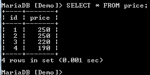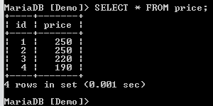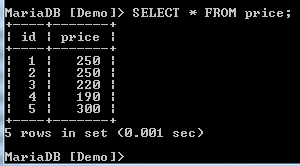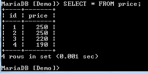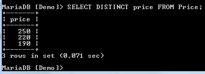 We have two records with a price of 250, creating a duplicate. We need to have only unique records. We can filter these by use of the DISTINCT clause as shown below: