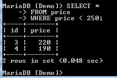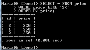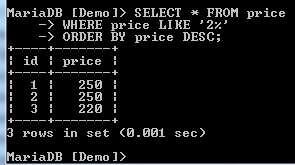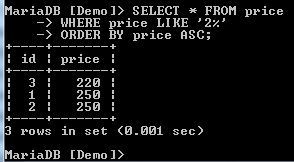 In the above command, we have ordered by the price. The records have been ordered with the prices in ascending order. That means that when we don't specify the order, the sorting is done in ascending order by default.