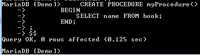 To demonstrate how to create and call a procedure, we will create a procedure named myProcedure() that helps us select the name column from the book table. Here is the procedure: