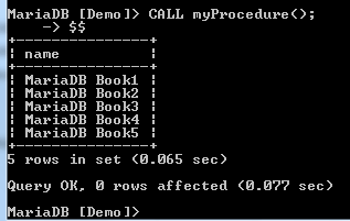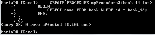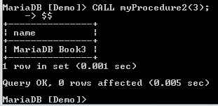 Above, we have created a procedure named myProcedure2(). This procedure takes one integer parameter named book_id which is the id of the book whose name we need to see. To see the name of the book with an id of 3, we can call the procedure as follows:
