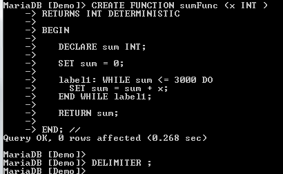 DELIMITER // CREATE FUNCTION sumFunc (x INT ) RETURNS INT DETERMINISTIC BEGIN DECLARE sum INT; SET sum = 0; label1: WHILE sum <= 3000 DO SET sum = sum + x; END WHILE label1; RETURN sum; END; // DELIMITER ;