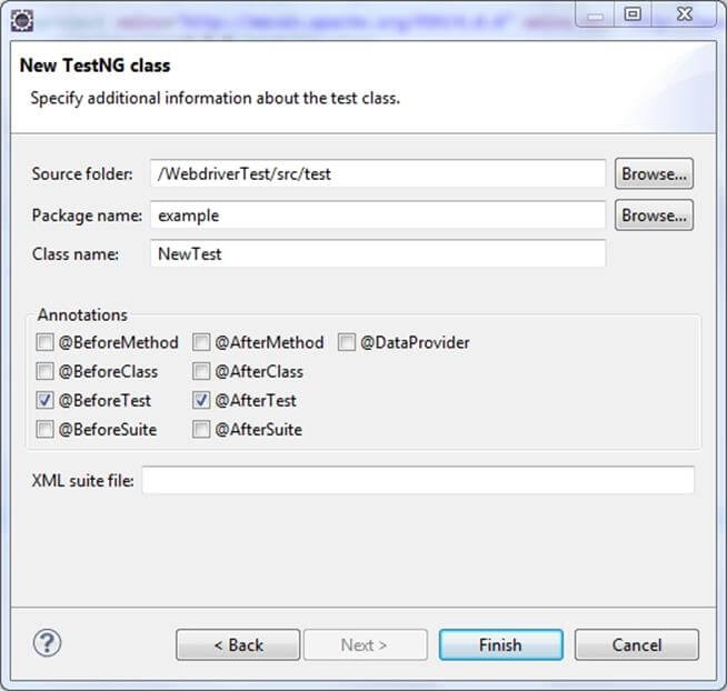 </dependencies>Step 9) Create a New TestNG Class. Enter Package name as "example" and "NewTest" in the Name: textbox and click on the Finish button as shown in the following screenshot: