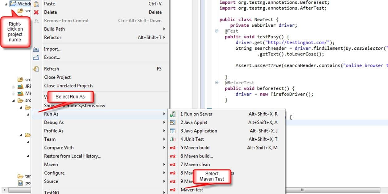 Step 15) To run the tests in the Maven lifecycle, Right-click on the WebdriverTest and select Run As | Maven test. Maven will execute test from the project.