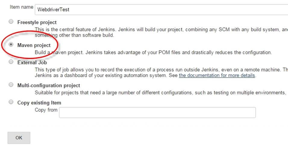 Step 6) Click on OK button. A new job with name "WebdriverTest" is created in Jenkins Dashboard.