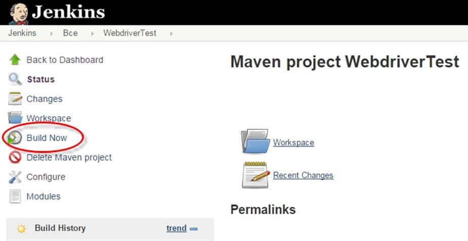 Step 10) On the WebdriverTest project page, click on the Build Now link.