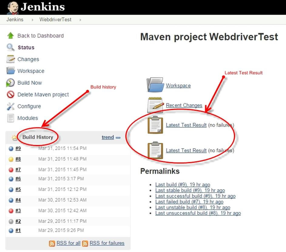 Step 12) The WebdriverTest project page displays the build history and links to the results as shown in the following screenshot: