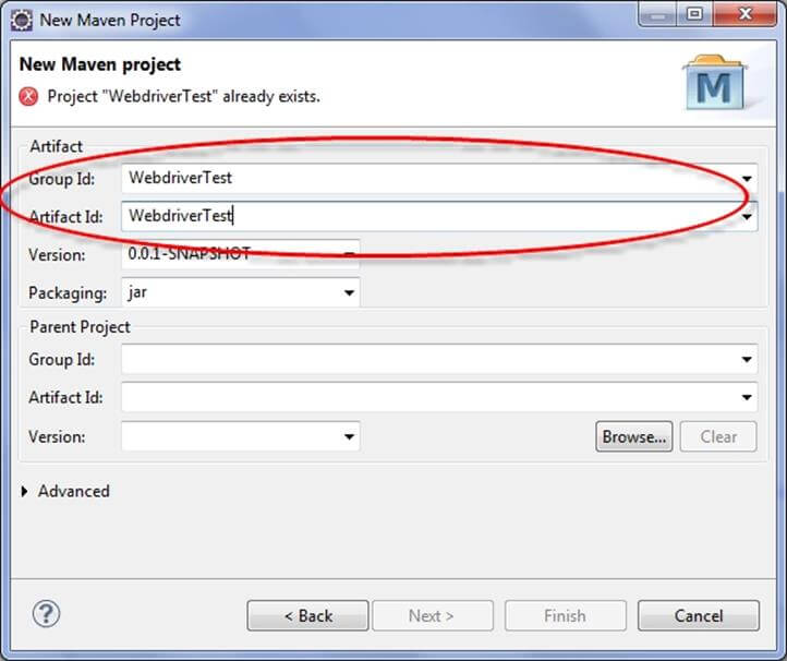 Step 4) Enter WebdriverTest in Group Id: and Artifact Id: and click finish