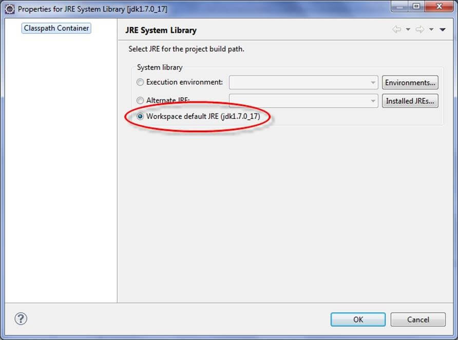 On the Properties for JRE System Library dialog box, make sure Workspace default JRE is selected and click OK