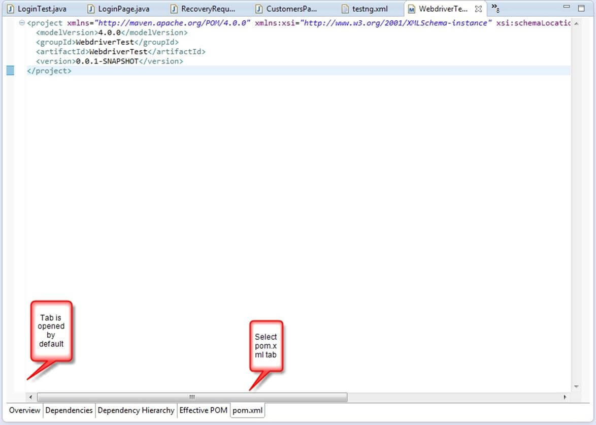 Step 8) Add the Selenium, Maven, TestNG, Junit dependencies to pom.xml in the <project> node: