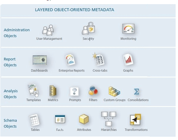 In Microstrategy, Object appears in the system layer for use in multiple projects. It includes configuration objects such as Schedules, Data Warehouse, and Login ID.