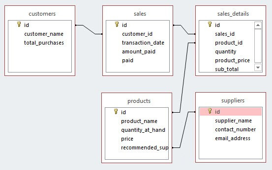| 3 | Products to suppliers | Id in suppliers | Recommended_supplier_id in products | Many to 1 |