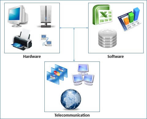 Hardware refers to the physical devices such as servers, workstations, printers, etc. The software most used included database servers, email servers, spreadsheet applications, word processors, etc. Local area networks and sometimes wide area networks are used to share resources among users.