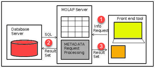 MOLAP architecture mainly reads the precompiled data. MOLAP architecture has limited capabilities to dynamically create aggregations or to calculate results that have not been pre-calculated and stored.