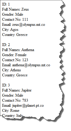 <?php CREATE TABLE IF NOT EXISTS `my_contacts` ( `id` int(11) NOT NULL AUTO_INCREMENT, `full_names` varchar(255) NOT NULL, `gender` varchar(6) NOT NULL, `contact_no` varchar(75) NOT NULL, `email` varchar(255) NOT NULL, `city` varchar(255) NOT NULL, `country` varchar(255) NOT NULL, PRIMARY KEY (`id`) ) ENGINE=InnoDB DEFAULT CHARSET=latin1 AUTO_INCREMENT=5 ; INSERT INTO `my_contacts` (`id`, `full_names`, `gender`, `contact_no`, `email`, `city`, `country`) VALUES (1, 'Zeus', 'Male', '111', 'zeus @ olympus . mt . co', 'Agos', 'Greece'), (2, 'Anthena', 'Female', '123', 'anthena @ olympus . mt . co', 'Athens', 'Greece'), (3, 'Jupiter', 'Male', '783', 'jupiter @ planet . pt . co', 'Rome', 'Italy'), (4, 'Venus', 'Female', '987', 'venus @ planet . pt . co', 'Mars', 'Italy'); ?>