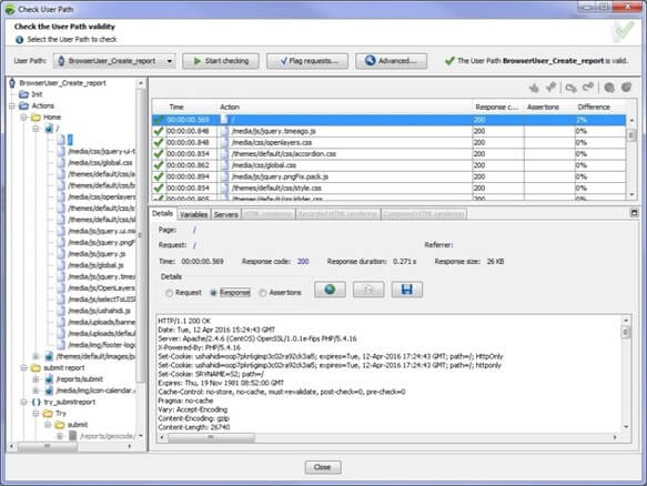 You can use NeoLoad testing tool to check the recorded content of your User Path to ensure that it complies with the application content. The Check User Path capability of NeoLoad helps you identify the number of changes between the recorded scenario and the checked one, and to pinpoint every change in the application with the Compare function, for example, changes in paths, in URL arguments, in AJAX calls, and so on.