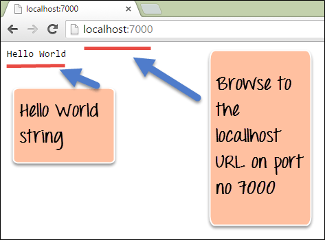 Our application is going to create a simple server module which will listen on port no 7000. If a request is made through the browser on this port no, then server application will send a 'Hello World' response to the client.